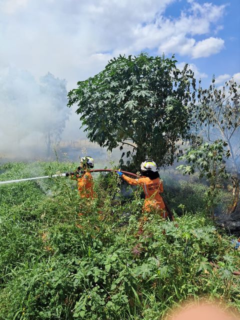 Devido à extensão da área atingida e à grande quantidade de vegetação, o combate às chamas exigiu empenho contínuo da equipe. Foram utilizados três lances de mangueiras, além de materiais de sapa, sendo necessário persistência dos combatentes para o completo controle da situação.