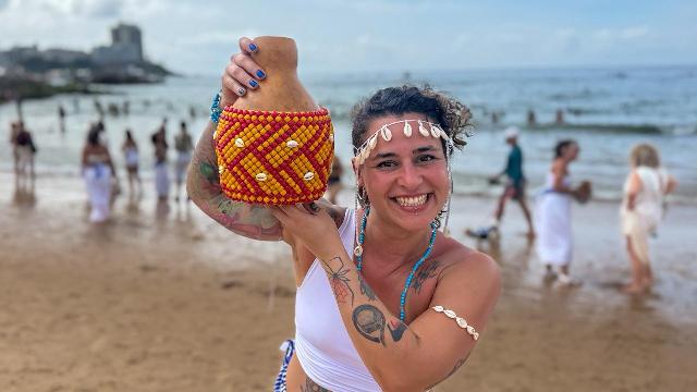 Vivenciando pela primeira vez a Oferenda Musical em Salvador, a percussionista Caroline Ester, mineira que reside atualmente na Alemanha, aproveitou as férias no Brasil para participar do cortejo. Aluna das aulas on-line de xequerê promovidas pelas Agbelas, ela veio especialmente para reverenciar a Rainha do Mar. “Foi uma experiência emocionante, difícil de colocar em palavras. A energia e o axé que circulam nesse encontro são únicos”, relatou.