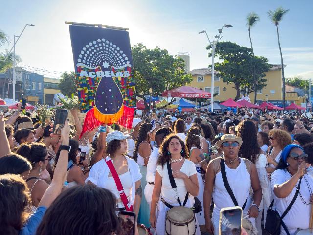 O colorido das miçangas marcava o ritmo do som da cabaça, enquanto agogôs, atabaques e alfaias conduziam o compasso do cortejo, que reuniu mulheres percussionistas da Bahia, de diferentes estados do Brasil e de várias partes do mundo. A força sonora e simbólica do encontro transformou as ruas do Rio Vermelho em um território de celebração coletiva, emoção e espiritualidade.