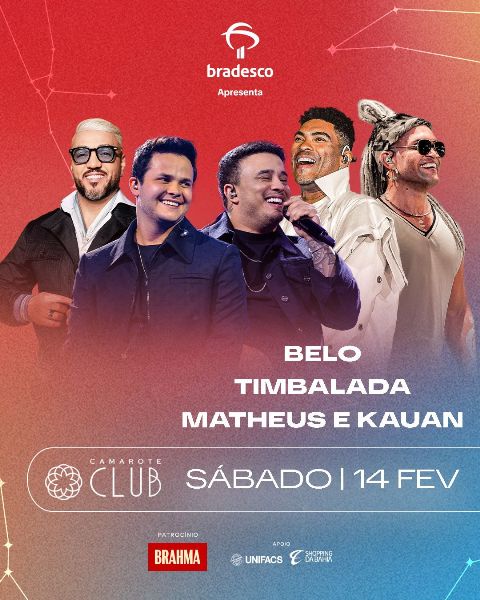 Além de Belo, Matheus e Kauan e Timbalada, o Camarote Club receberá também Henry Freitas, Natanzinho Lima e Felipe Amorim (quinta-feira), o forró de Wesley Safadão e o som percussivo do grupo Menos É Mais (sexta), as batidas eletrônicas de Alok e o carisma de Claudia Leitte (domingo), o pagode contagiante de Xanddy Harmonia, o balanssu da Filhos de Jorge e o romantismo de Thiaguinho (segunda-feira) e, encerrando a folia, na terça-feira GG Léo Santana, Sorriso Maroto e Alexandre Peixe com o projeto Axézin.