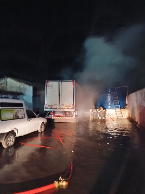 O incêndio consumiu completamente a cabine do veículo, além de atingir parte do compartimento de carga e materiais transportados. Estruturas próximas também sofreram danos em decorrência da ação do fogo e do calor.