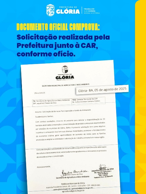 As barracas foram solicitadas oficialmente pela própria Prefeitura de Glória, por meio da Secretaria Municipal de Agricultura e Meio Ambiente, junto à Companhia de Desenvolvimento e Ação Regional (CAR), conforme comprovado em ofício encaminhado pela gestão municipal.