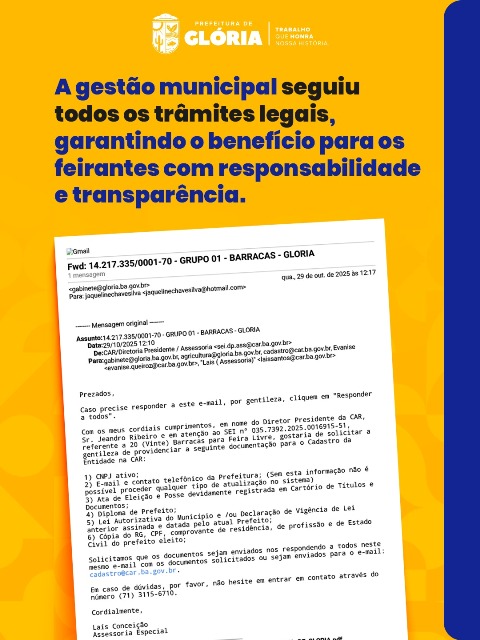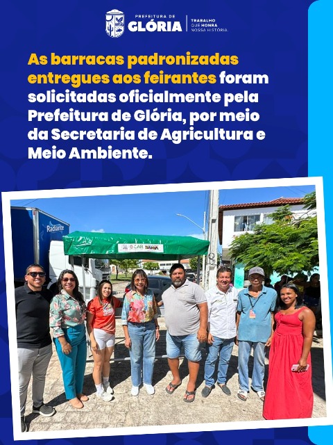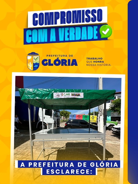 A Prefeitura de Glória vem a público esclarecer informações divulgadas em rede social por um parlamentar, que afirma ter sido responsável pela destinação das barracas padronizadas entregues aos feirantes do município.