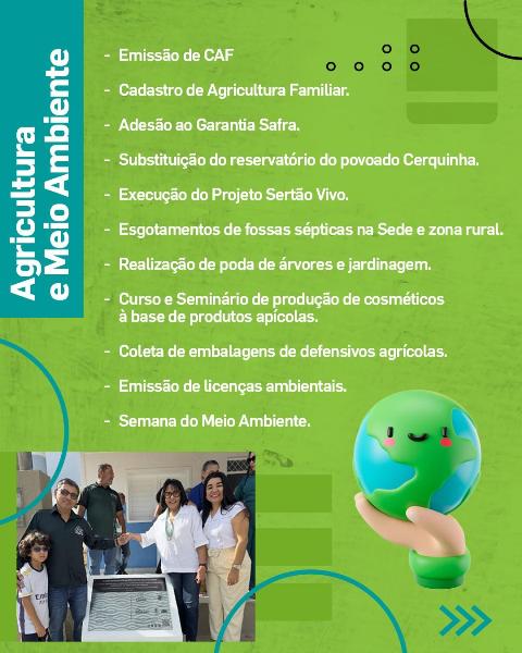 Apoio ao agricultor familiar, adesões a programas, melhorias no abastecimento, ações ambientais, coleta de embalagens, cursos e serviços essenciais tanto na sede quanto nos povoados.