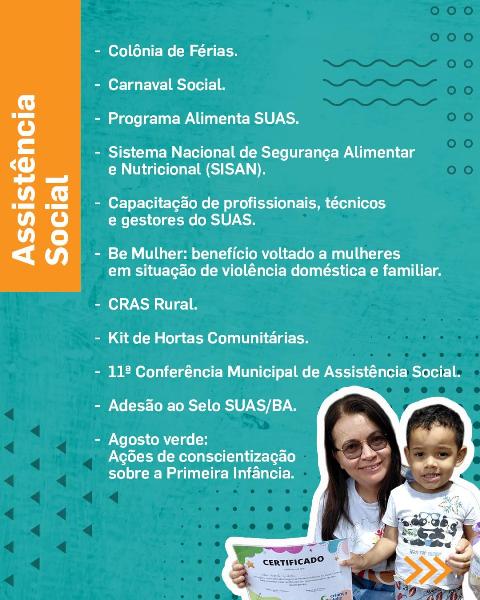 Atividades voltadas às famílias, programas direcionados às mulheres, implantação do CRAS Rural, conferência municipal, capacitações e ações voltadas à Primeira Infância.
