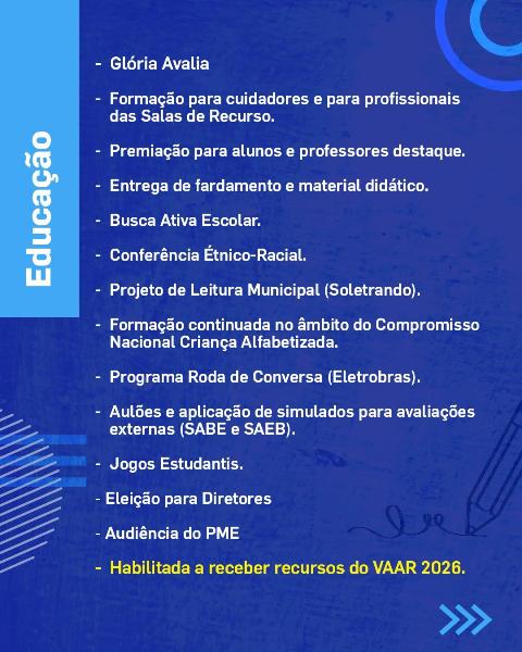 Formações para profissionais, entregas de materiais, ações pedagógicas, programas de acompanhamento da aprendizagem, projetos de leitura, premiações, atividades esportivas, eleição para diretores e habilitação para receber recursos do VAAR 2026.