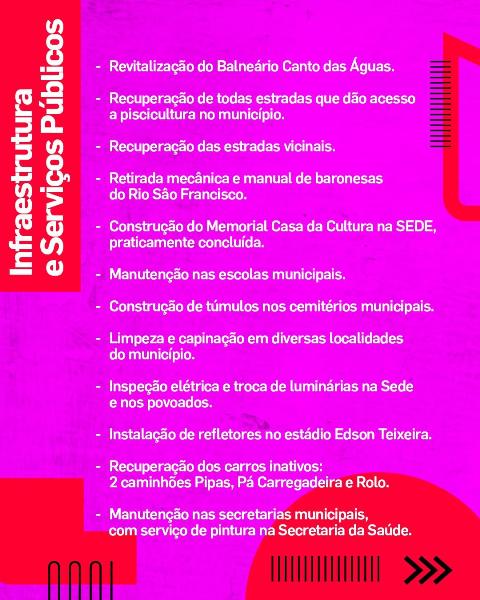 Recuperação de estradas, revitalização de espaços públicos, manutenção das escolas, iluminação, obras em andamento e recuperação de máquinas e veículos.