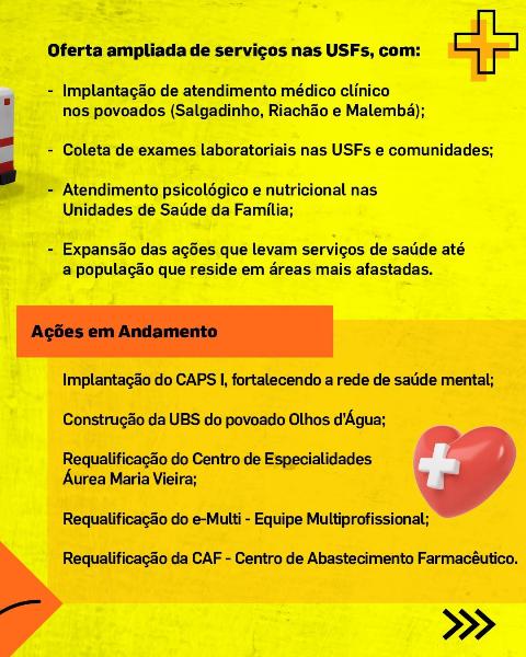 Ampliação dos atendimentos nos povoados, chegada de novos veículos, melhorias na Saúde Bucal, expansão do Projeto ACOLHER, novos serviços nas Unidades de Saúde e andamento de obras estruturantes, como o CAPS I e requalificações da rede.